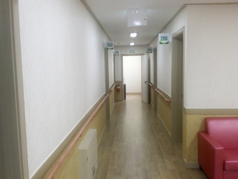 2층에는 어르신 숙소 (201~206), 간호사실, 프로그램실이 있습니다.