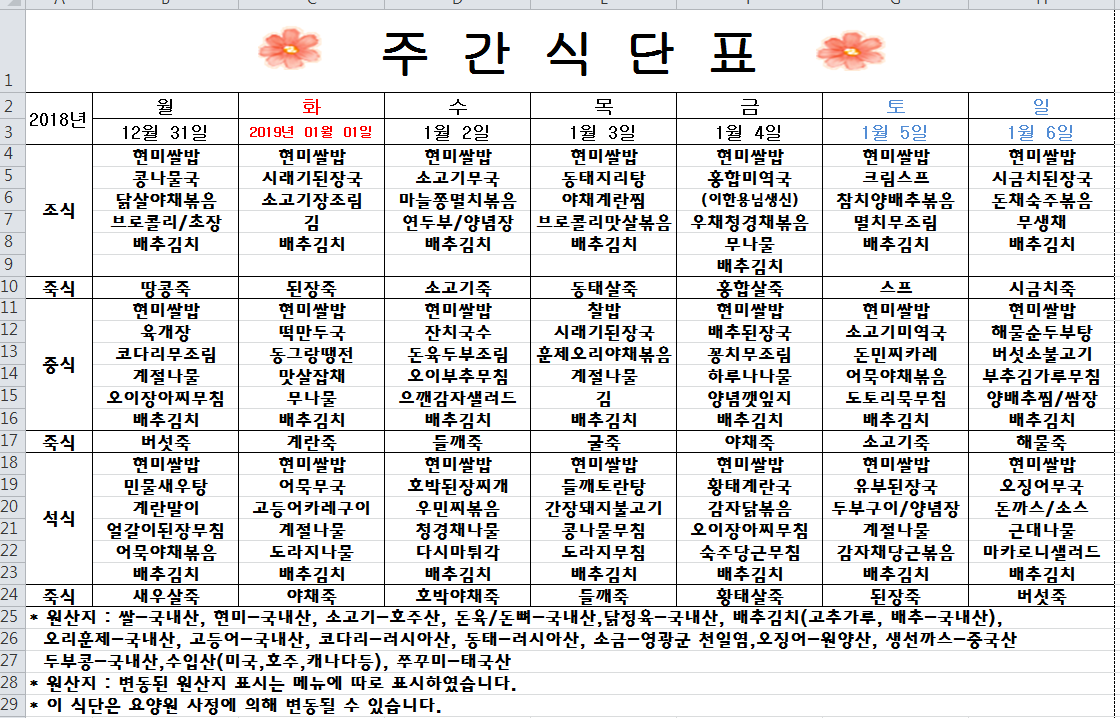 주간식단표(2018.12.31 ~2019.01.06)입니다.