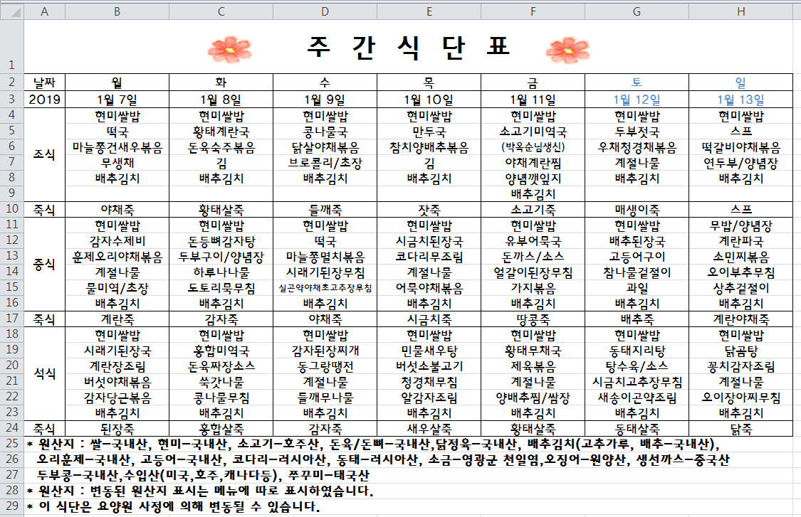 주간식단표(2019.01.07. ~ 2019.01.13)입니다.