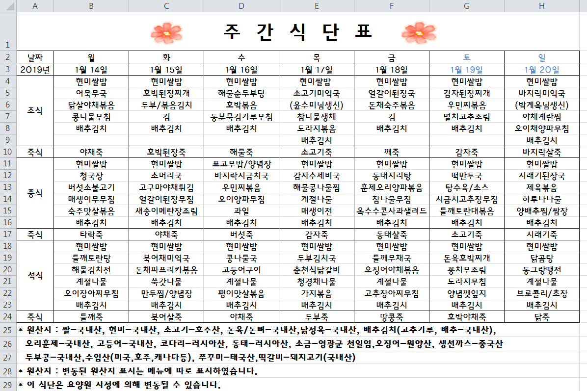 주간식단표(2019.01.14. ~2019.01.20.)입니다.^^