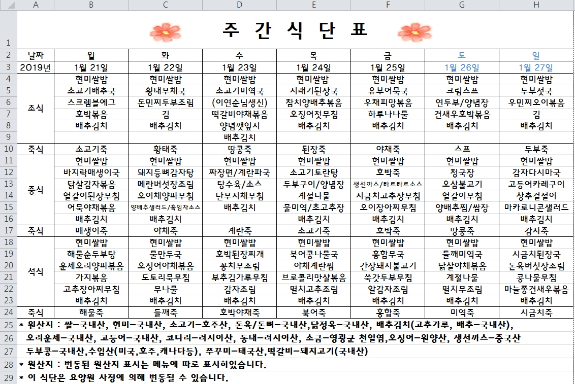 주간식단표(2019.01.21 ~2019.01.27.)입니다.^^