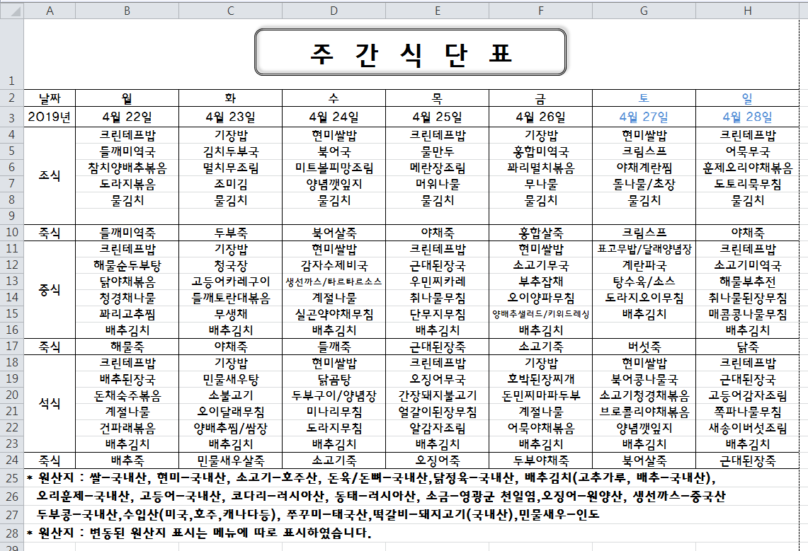 주간식단표(2019.04.22 ~ 2019.04.28)입니다.