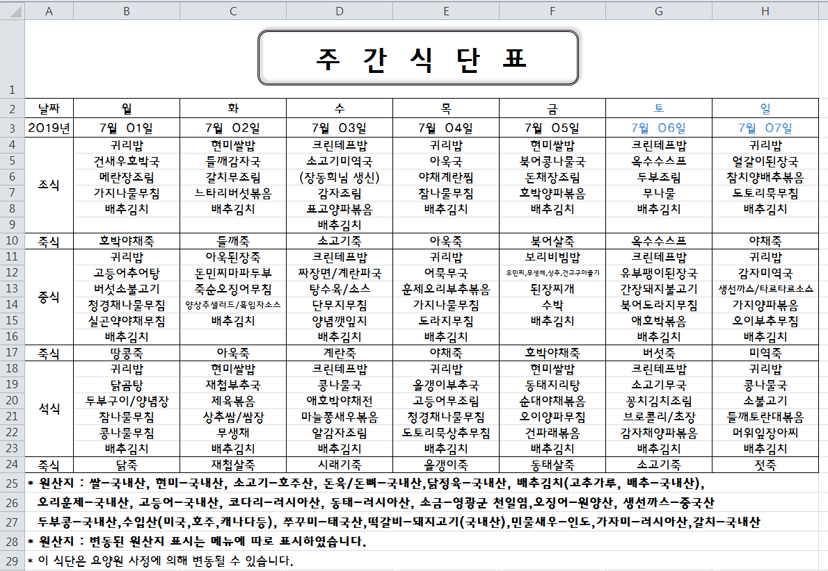 주간식단표(219.07.01 ~ 2019.07.07)입니다.