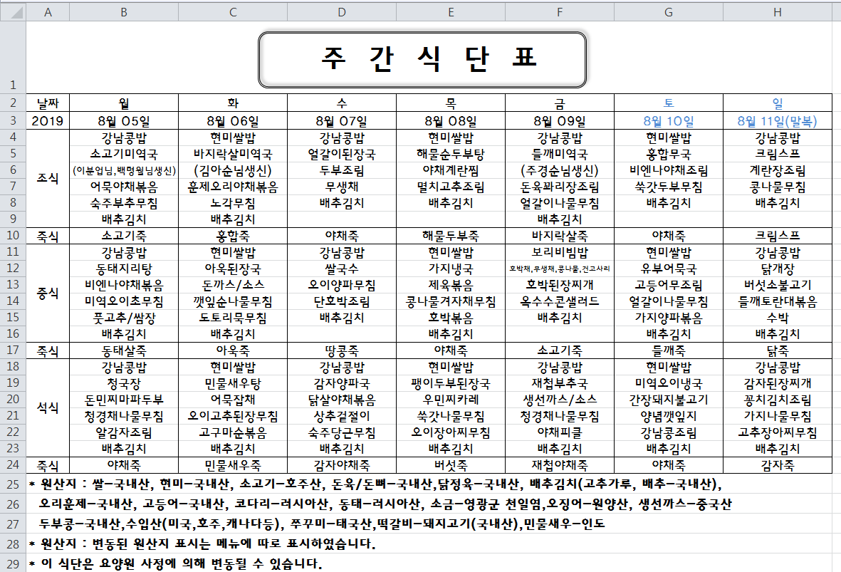 주간식단표(2019.08.05 ~ 2019.08.11)입니다.