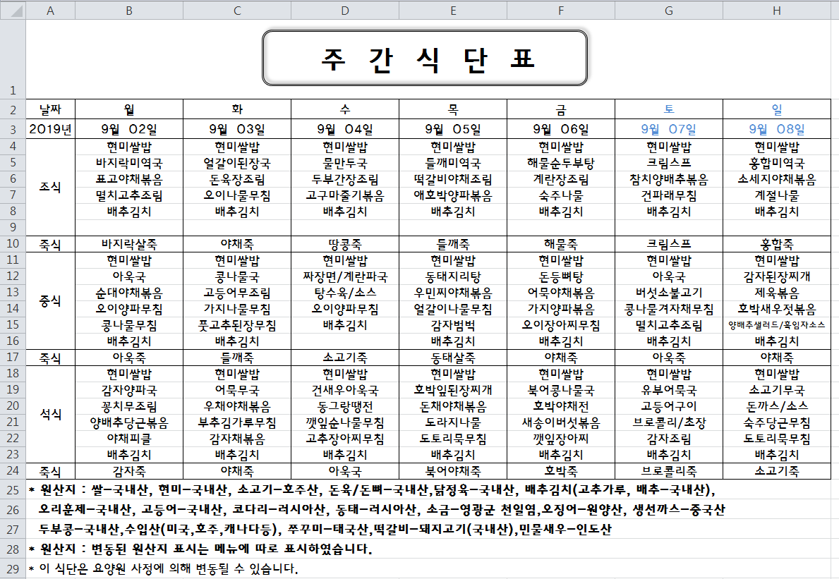 주간식단표(2019.09.02 ~ 2019.09.08)입니다.