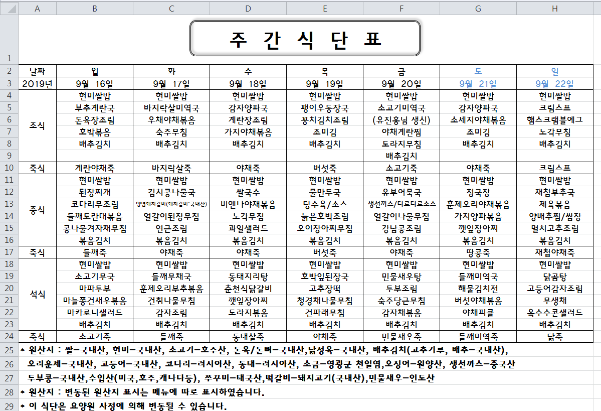 주간식단표(2019.09.16 ~2019.09.22)입니다.