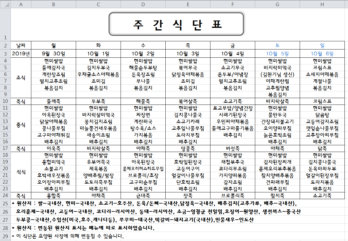 주간식단표(2019.09.30 ~ 2019.10.6)입니다.