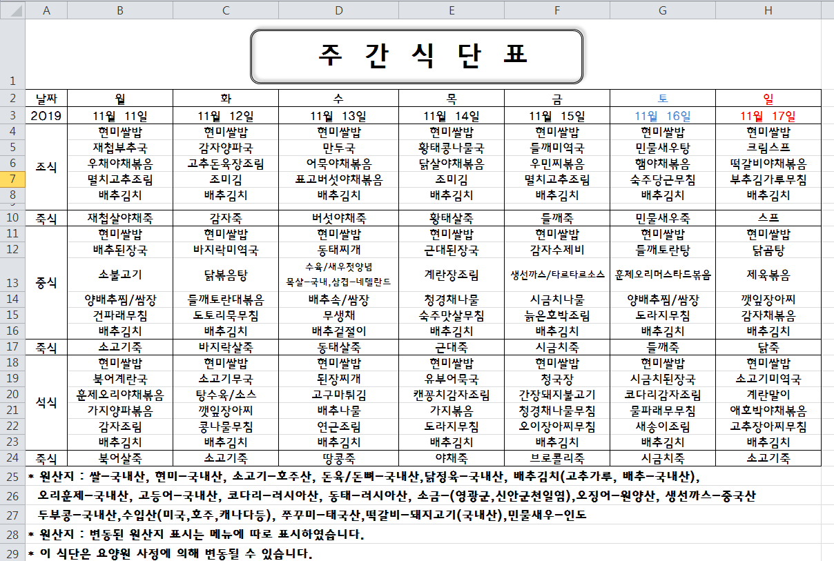 주간식단표(2019.11.11 ~ 2019.11.17)입니다.