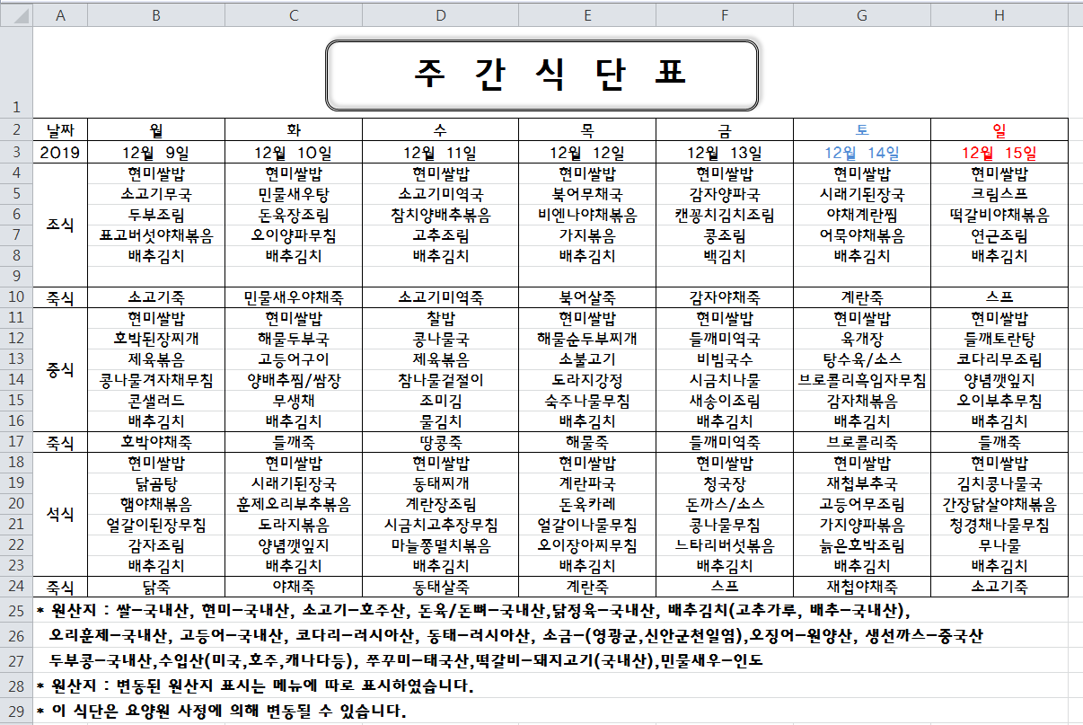주간식단표(2019 12.09 ~ 2019.12.15)입니다.