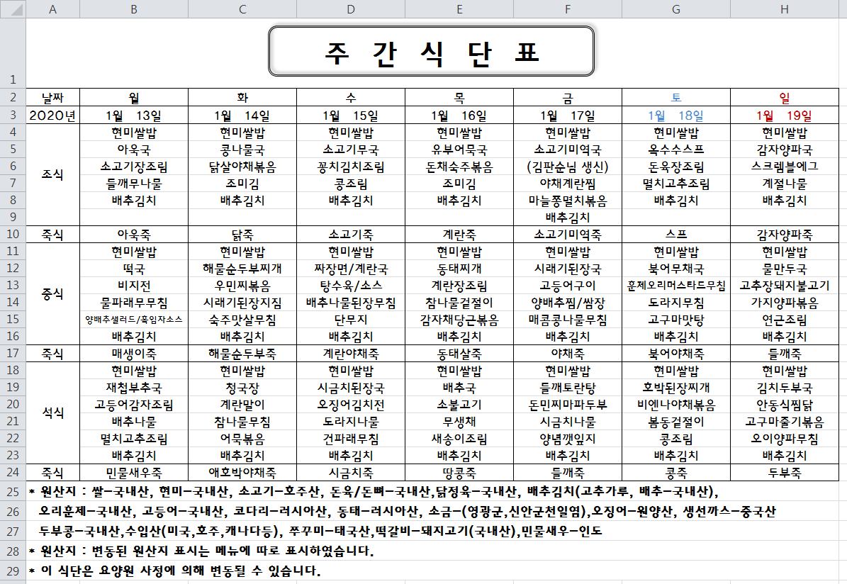 주간식단표(2020.1.13 ~ 2020.1.19)입니다.