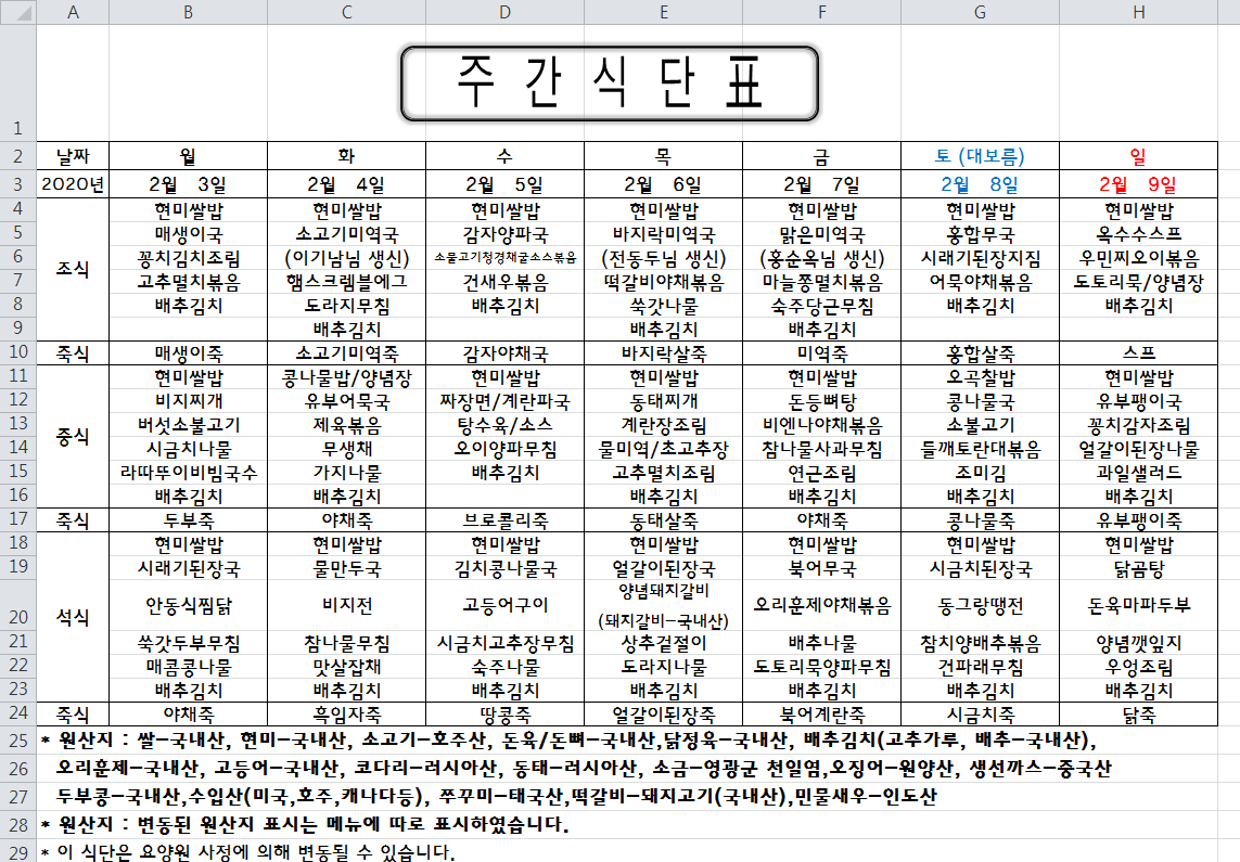 주간식단표(2020.02.03 ~2020.02.09)입니다.^^