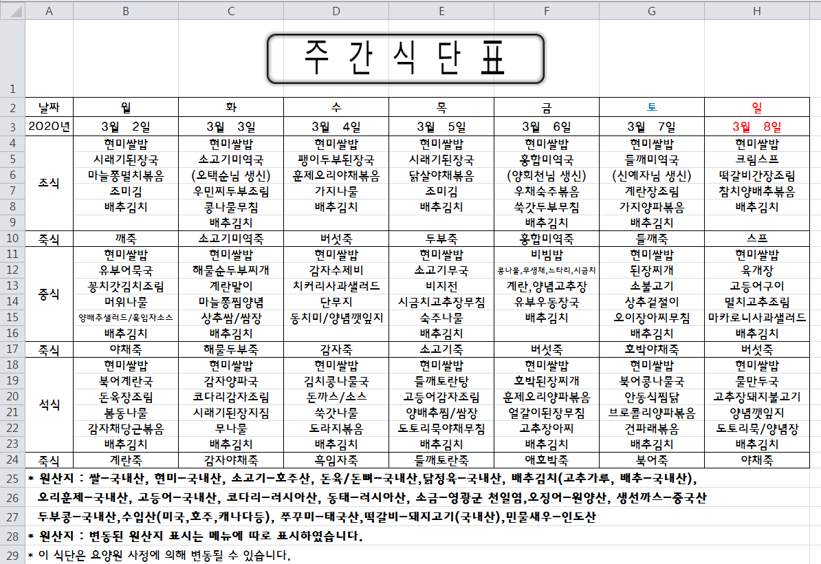 주간식단표(2020.03.02 ~ 2020.03.08)입니다.