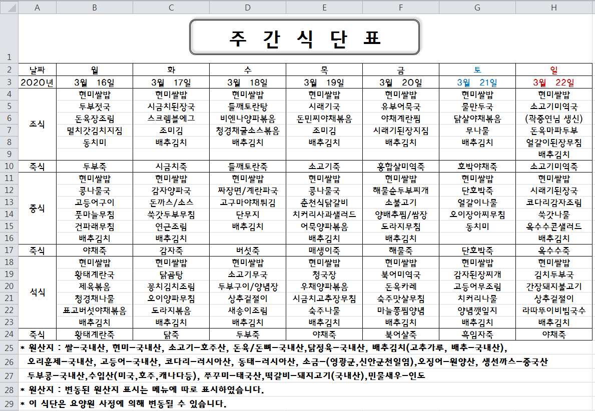 주간식단표(2020.03.16 ~ 2020.0322)입니다.