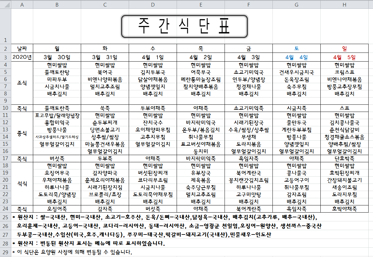 주간식단표(2020.03.30 ~ 2020.04.04.05)