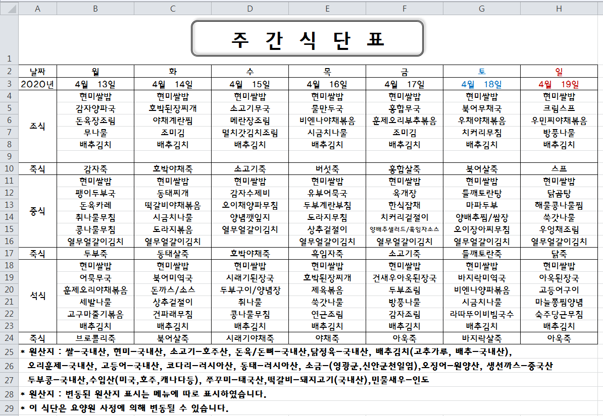 주간식단표(2020.04.13 ~ 2020.04.19)