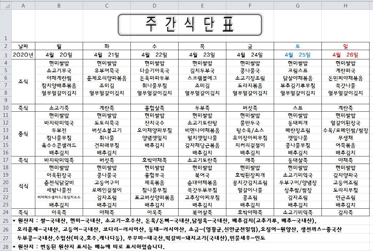 주간식단표(2020.04.20 ~ 2020.04.26)
