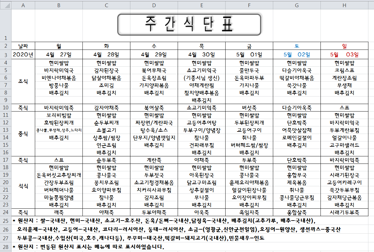 주간식단표(2020.04.27 ~ 2020.5.03)