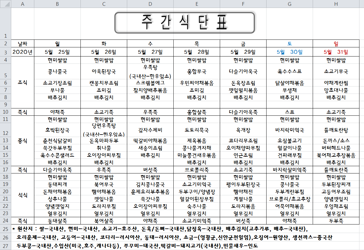 주간식단표(2020.05.25 ~ 2020.05.31)