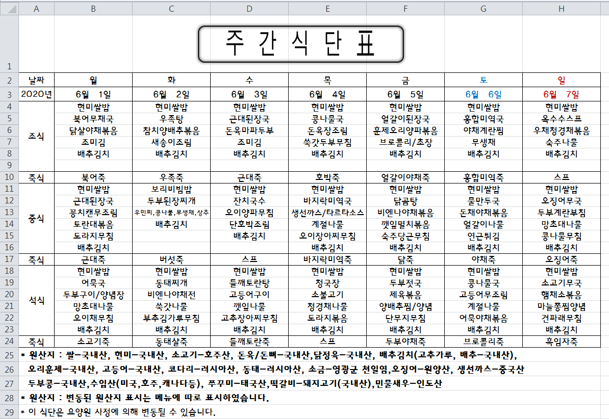 주간식단표(2020.06.01 ~ 2020.06.07)