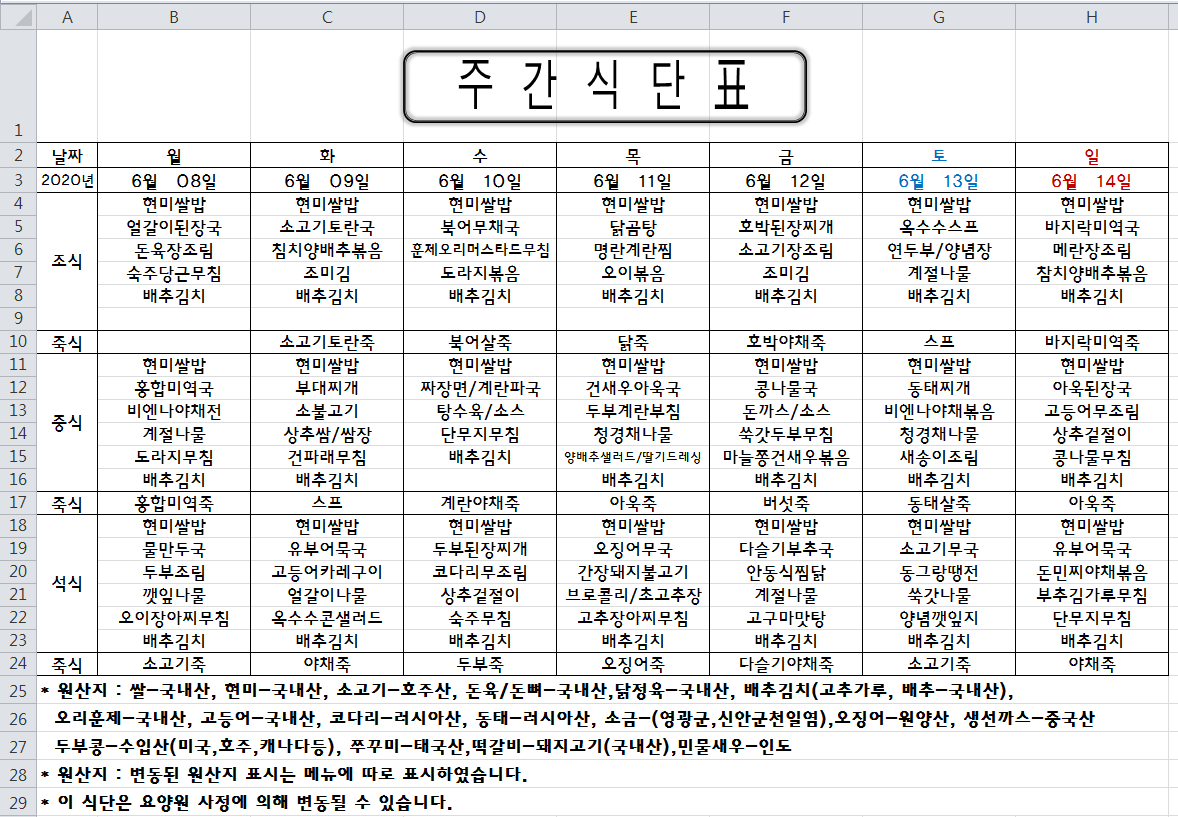 주간식단표(2020.06.08 ~ 2020.06.14)