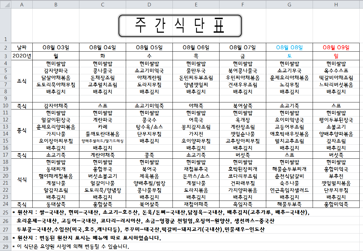 주간식단표(2020.08.03 ~ 2020.08.09)