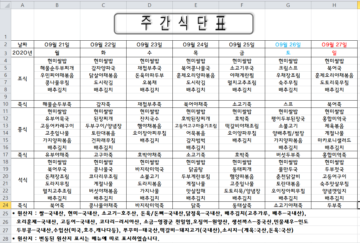 주간식단표(2020.09.21 ~ 2020.09.27)