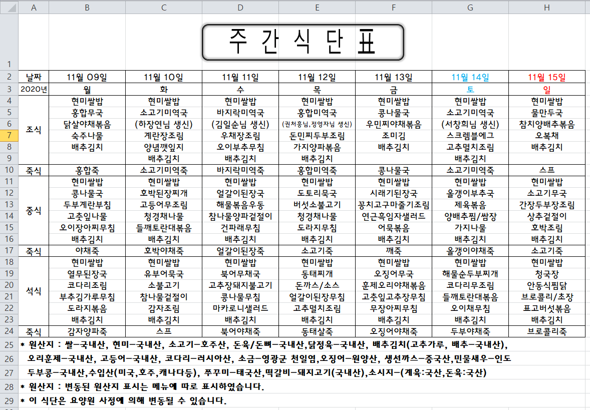 주간식단표(2020.11.09 ~ 2020.11.15)