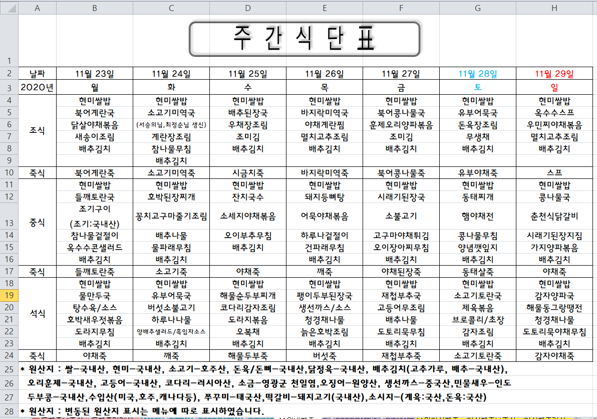 주간식단표(2020.11.23 ~2020.11.29)