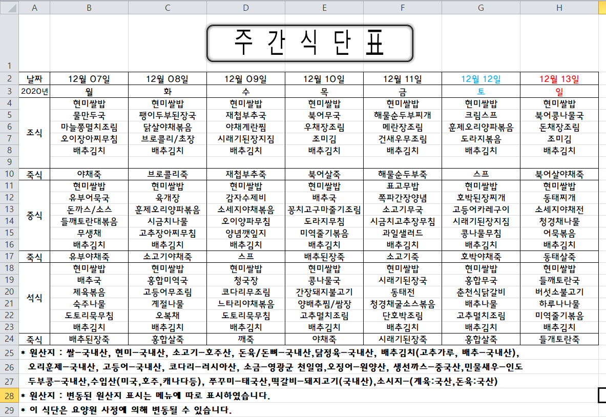 주간식단표(2020.12.07 ~2020.12.13)