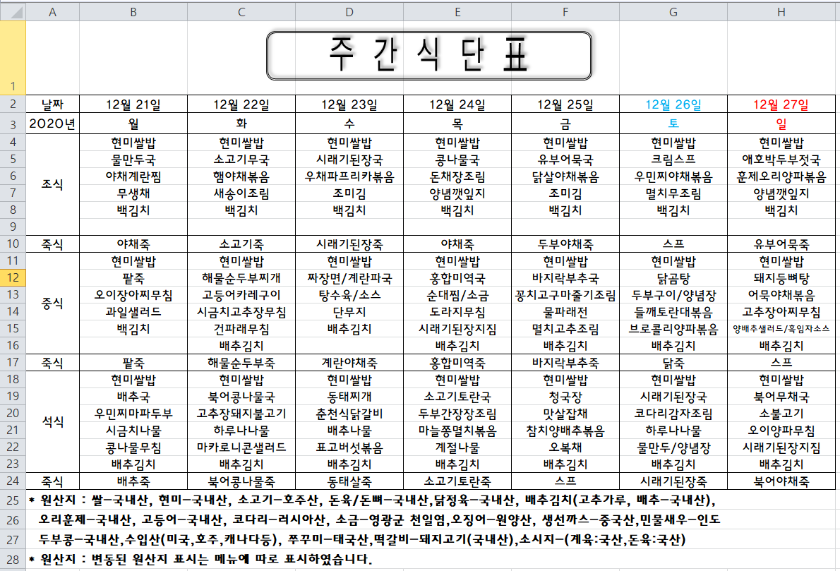 주간식단표(2020.12.21 ~ 2020.12.27)