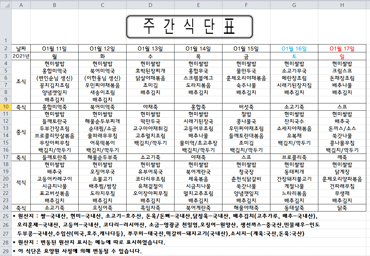 주간식단표(2021.01.11 ~ 2021.01.17)