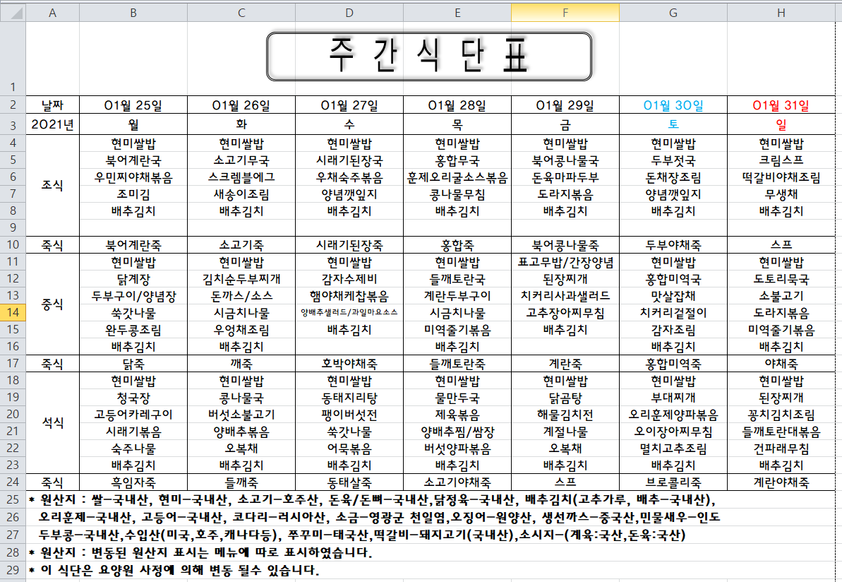주간식단표(2021.01.25 ~ 2021.01.31)