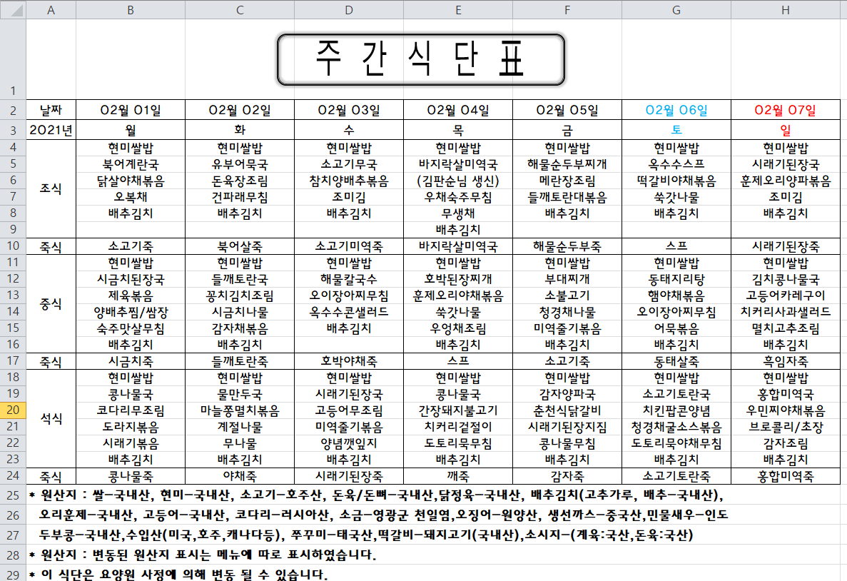 주간식단표(2021.02.01 ~ 2021.02.07)
