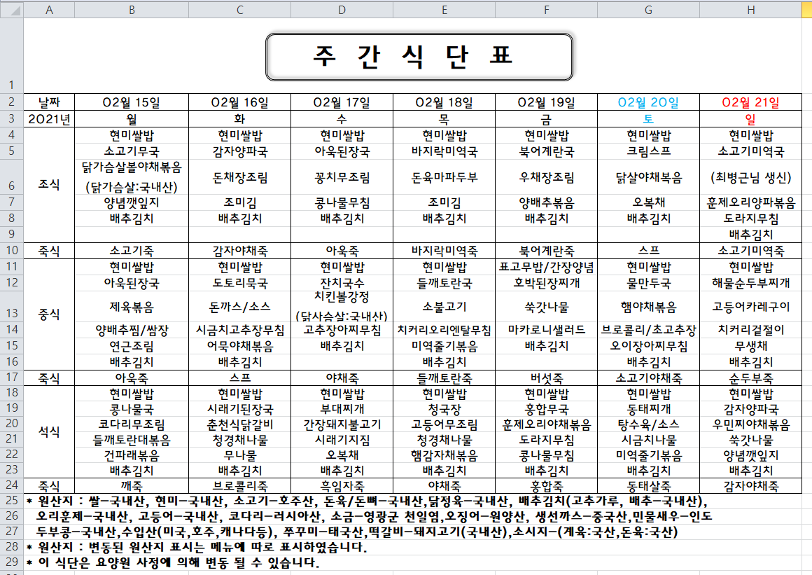 주간식단표(2021.02.15 ~ 2021.02.21)