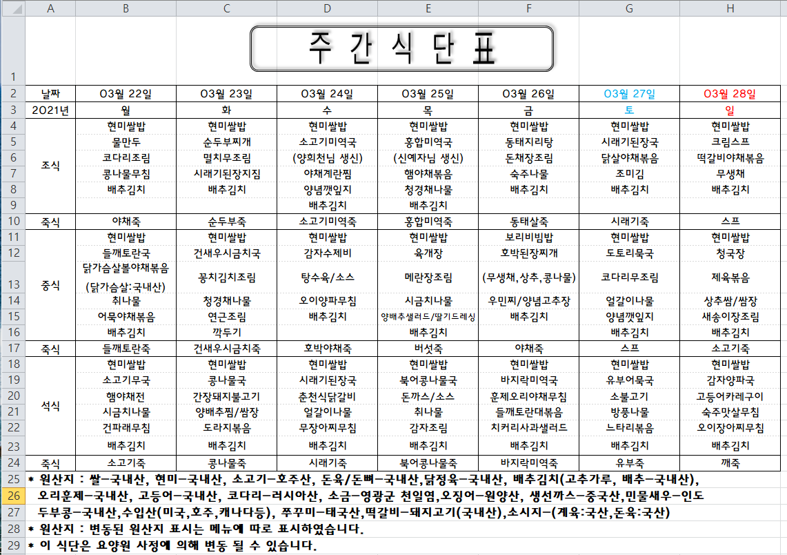 주간식단표 (2021.03.22 ~ 2021.03.28)