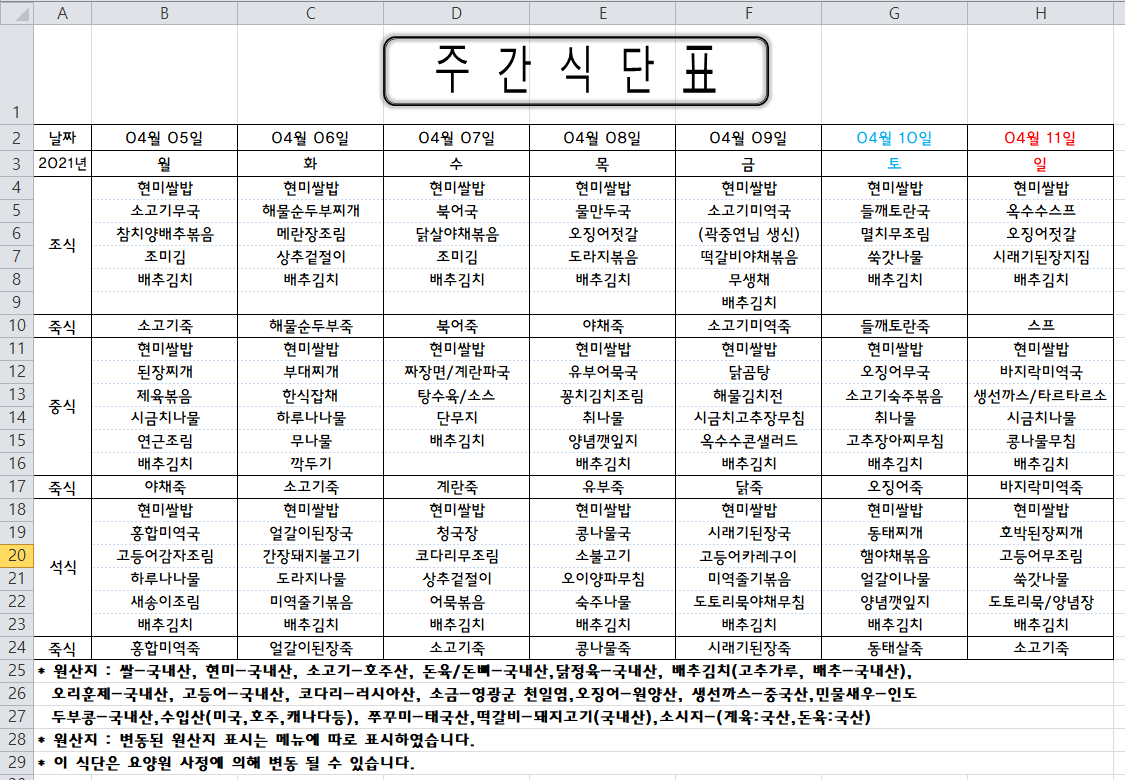 주간식단표(2021.04.05 ~ 2021.04.11)