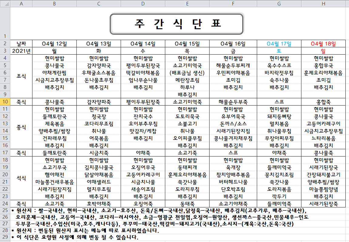 주간식단표(2021. 04. 12 ~ 2021.04.18)