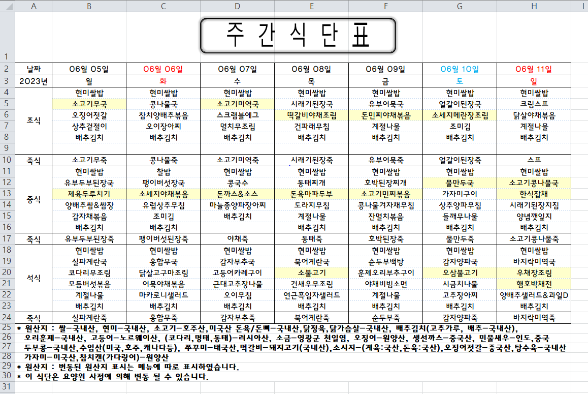 주간식단표 (2023.06.05 ~ 2023.06.11)