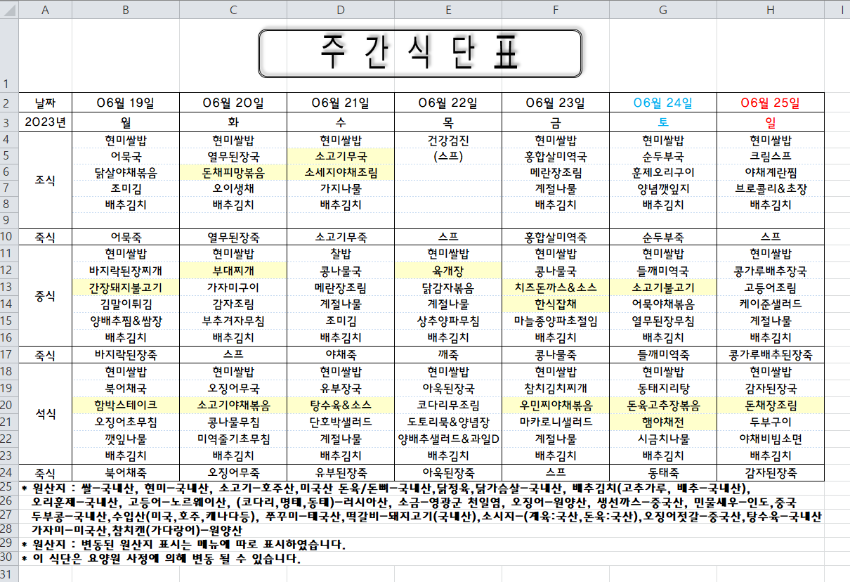 주간식단표 (2023.06.19 ~ 2023.06.25)