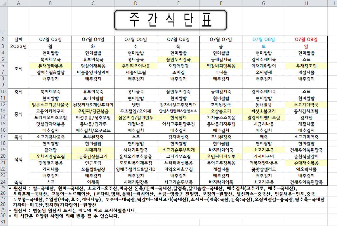 주간식단표 (2023.07.03 ~ 2023.07.09)