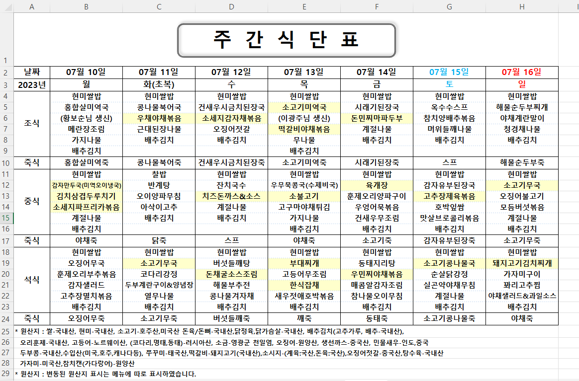 주간식단표 (2023.07.10 ~ 2023.07.16)
