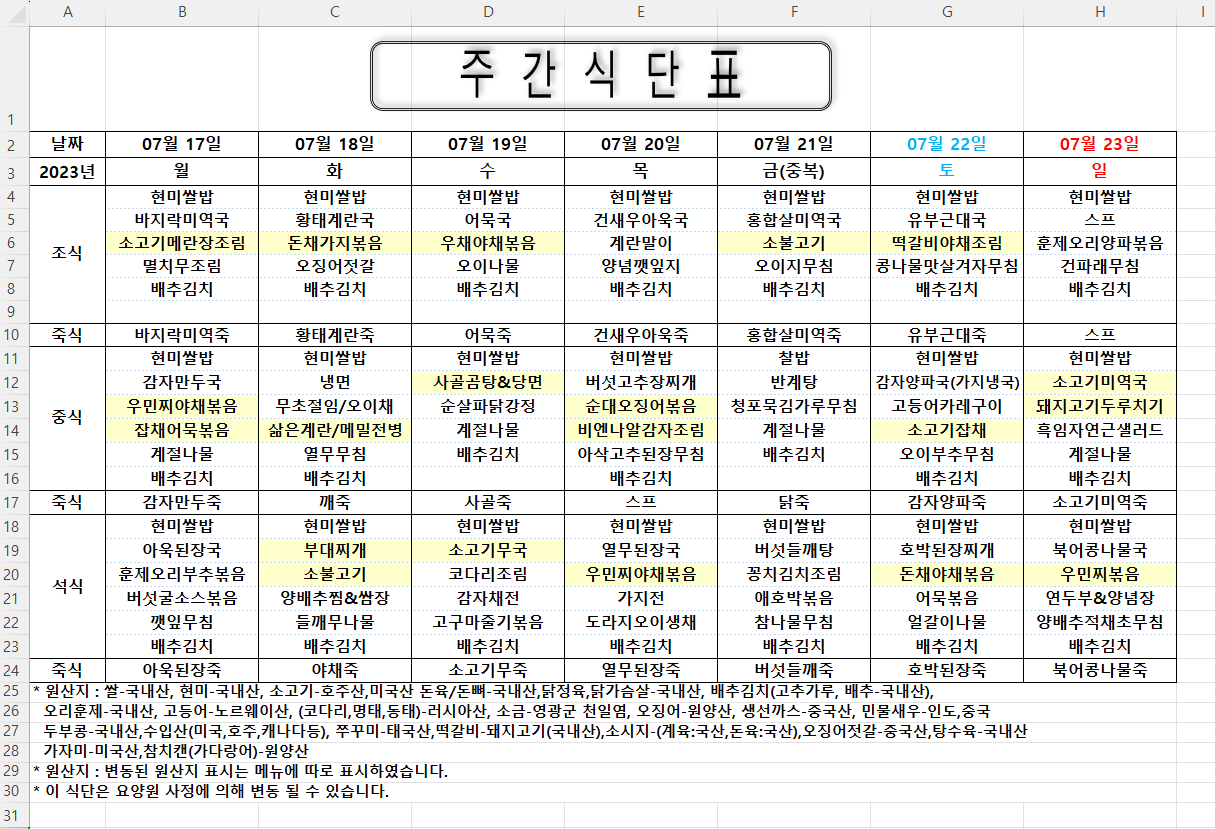 주간식단표 (2023.07.17 ~ 2023.07.23)