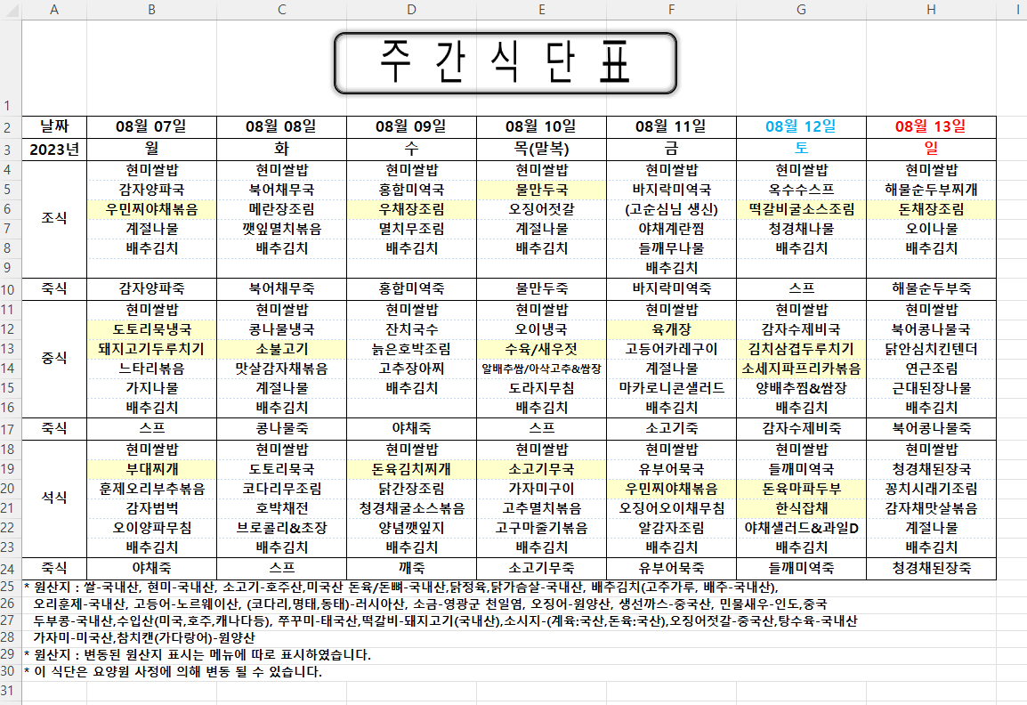주간식단표 (2023.08.07 ~ 2023.08.13)