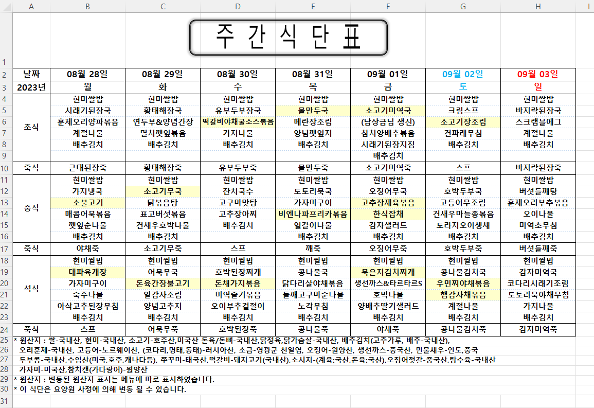 주간식단표 (2023.08.28 ~ 2023.09.03)