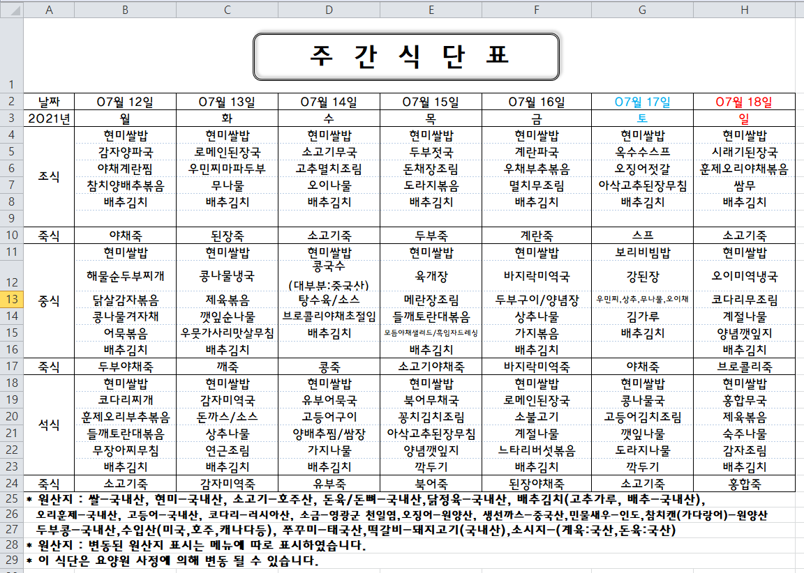 주간식단표(2021.07.12 ~ 2021.07.18)
