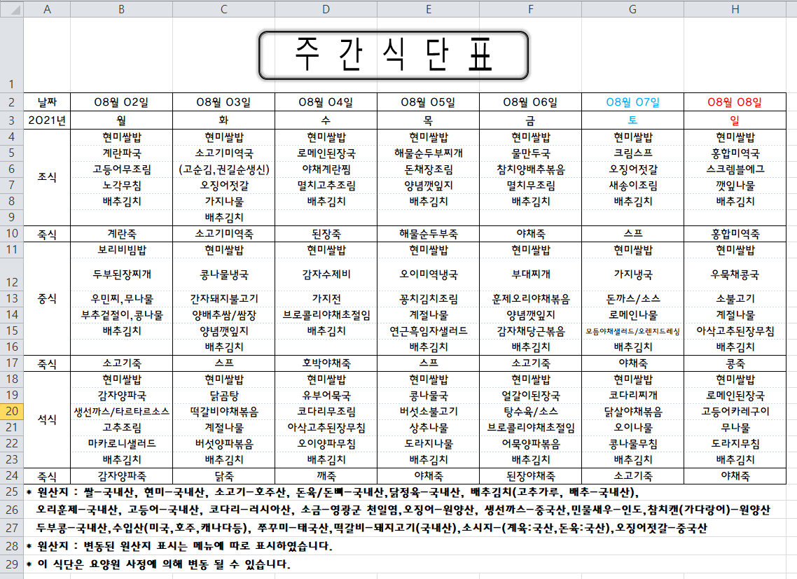 주간식단표(2021. 08.02~ 2021.08.08)