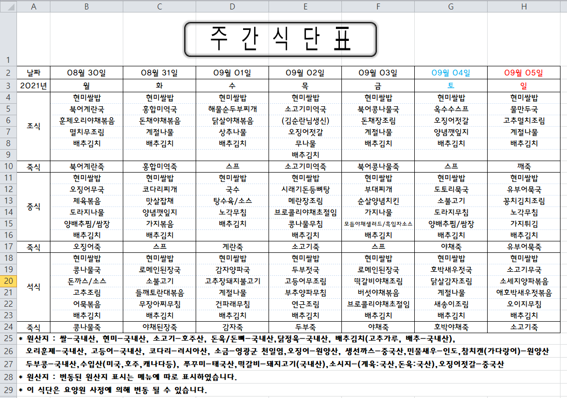 주간식단표(2021.08.30 ~ 2021.09.05)