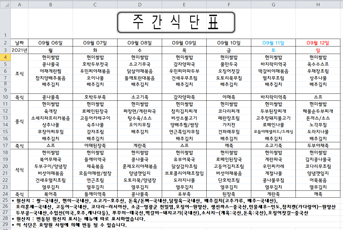 주간식단표(2021.09.06 ~ 2021.09.12)
