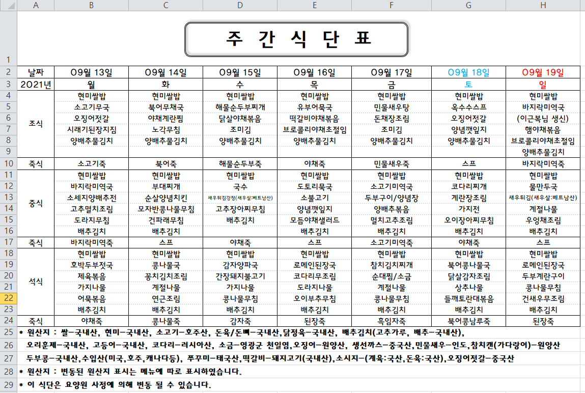 주간식단표(2021.09.13 ~ 2021.09.19)