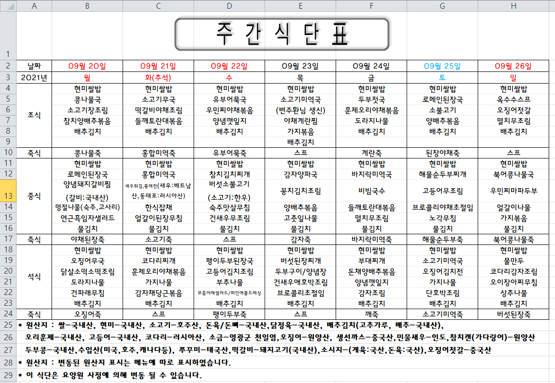 주간식단표(2021.09.20 ~ 2021.09.26)